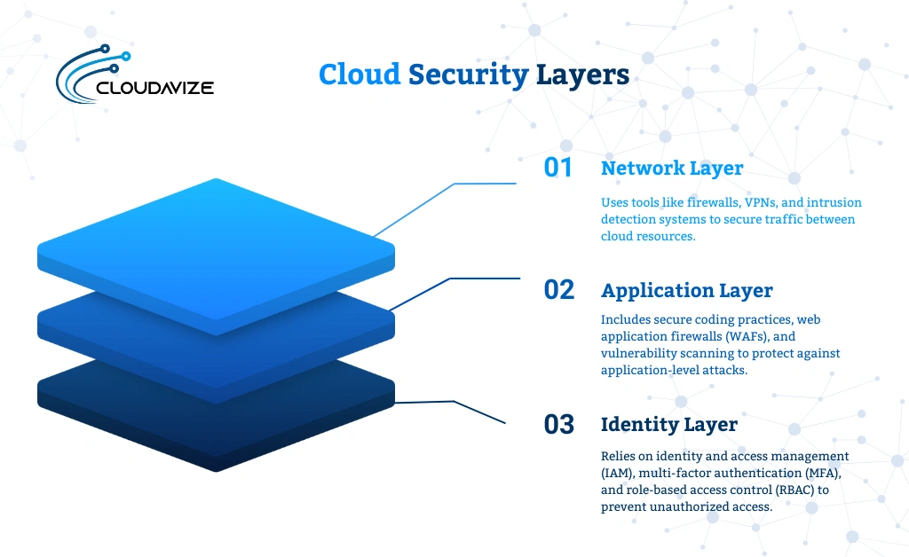 - Network Layer: Uses tools like firewalls, VPNs, and intrusion detection systems to secure traffic between cloud resources.