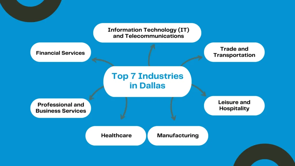 Dallas stands out as a leading economic powerhouse in Texas, powered by thriving industries that drive its success and growth. The city’s economy flourishes through 7 major industries like Information Technology and Telecommunications succeeding by Manufacturing, Trade and Transportation, Financial Services, Professional and Business Services, Healthcare, and Leisure and Hospitality. These top industries in Dallas, Texas play a pivotal role in shaping the city into a center for job creation, technological advancement, and economic opportunity. From leading global companies to innovative local businesses, each sector contributes to the city’s economic growth.