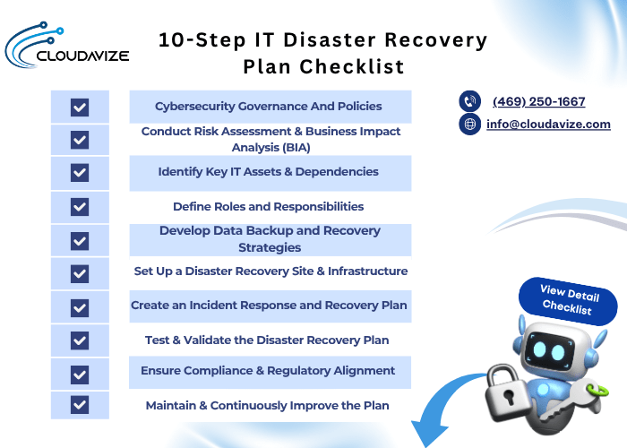Cloudavize, a trusted managed service provider, helps SMBs and enterprises develop, test, and maintain effective DR checklists tailored to their specific needs. By conducting regular simulations, tabletop exercises, and system recovery drills, Cloudavize ensures that your disaster recovery processes remain current, reliable, and fully aligned with business continuity goals.