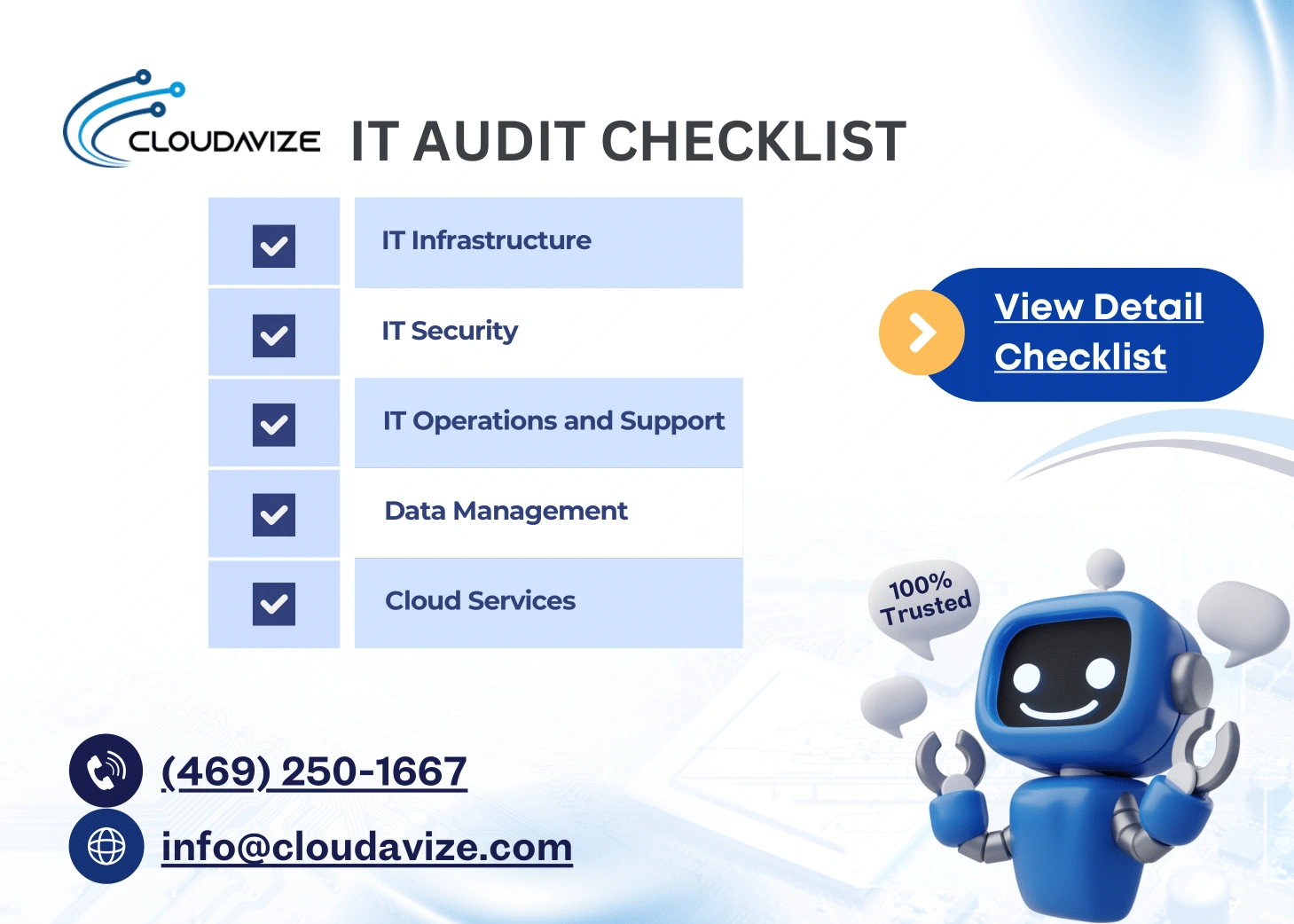 With growing cloud adoption, IT audits must address cloud security, vendor management, and identity governance. The checklist should include:
